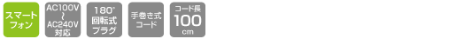 | 製品仕様 | ●本体サイズ:W52×H61×D23mm(コード、ACプラグ含まず) ●本体質量:約53g(コード含む) ●材質:本体ケース/PC、microUSBコネクタ・コード/PVC ●入力定格:AC100V〜240V/50-60Hz 12VA ●出力定格:DC5V 0.8A ●コード長:約1m ※仕様および外観は、性能改良のため予告なく変更することがあります。 |