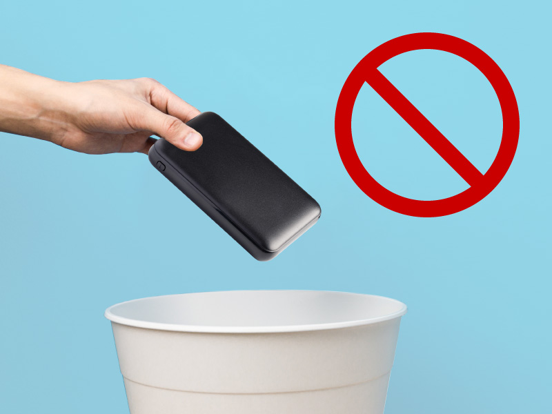 多くのモバイルバッテリーには「リチウムイオン電池」が使われており、多くの自治体で は家庭ごみとしての廃棄を禁止しています。 家庭ごみとして処分出来ないモバイルバッテリーは、リサイクルに出すのが最もかんた んで安心です。