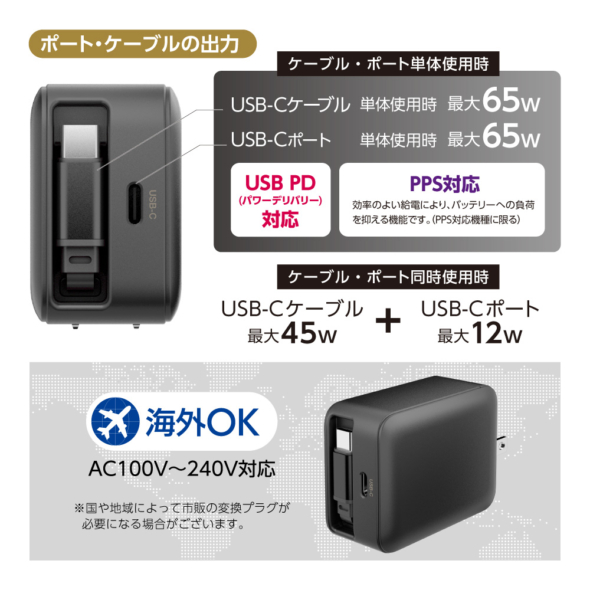 出力 :[USB-Cケーブル] 単体使用時最大65W