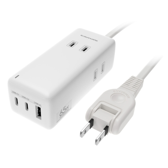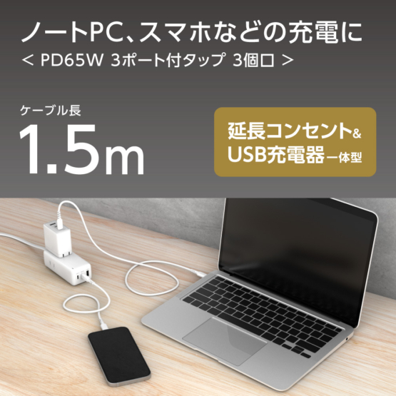 ●最大65WのPD(PowerDelivery)に対応したUSB-Cポート(×2)と、USB-Aポート(×1)を搭載した、コンセント3個付きACタップ。