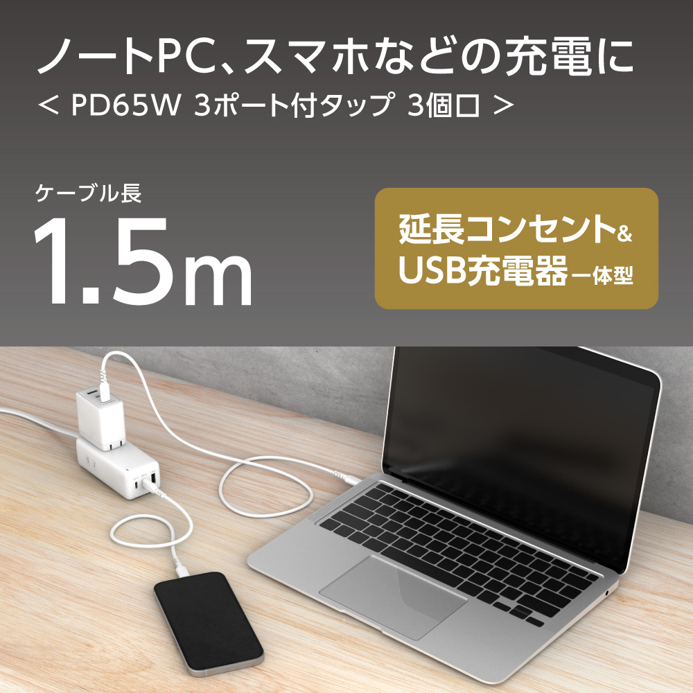 PD65W 3ポート付タップ3個口 ホワイト