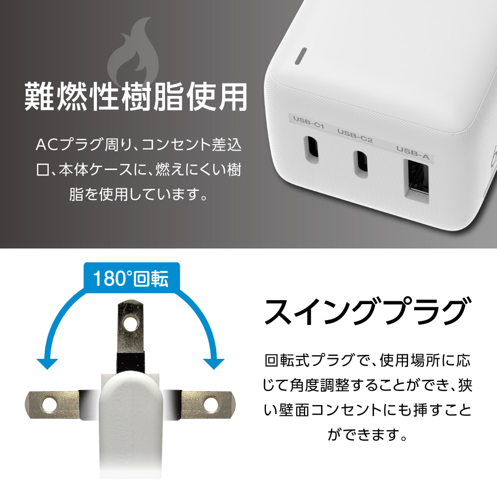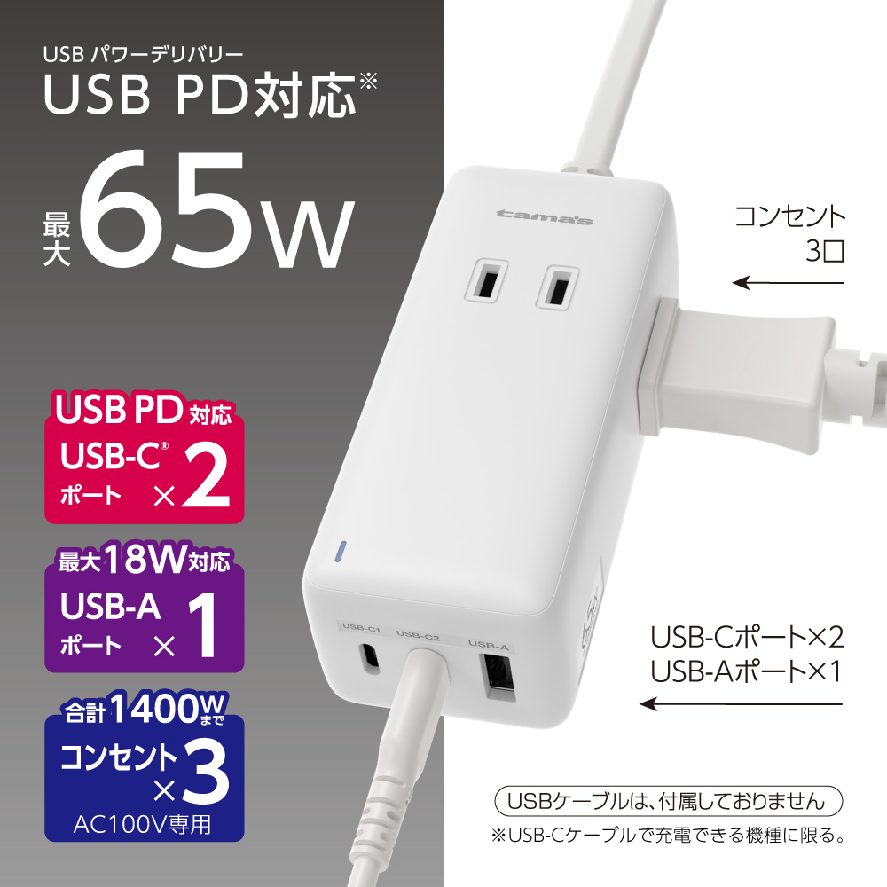 ●最大65WのPD(PowerDelivery)に対応したUSB-Cポート(×2)と、USB-Aポート(×1)を搭載した、コンセント3個付きACタップ。