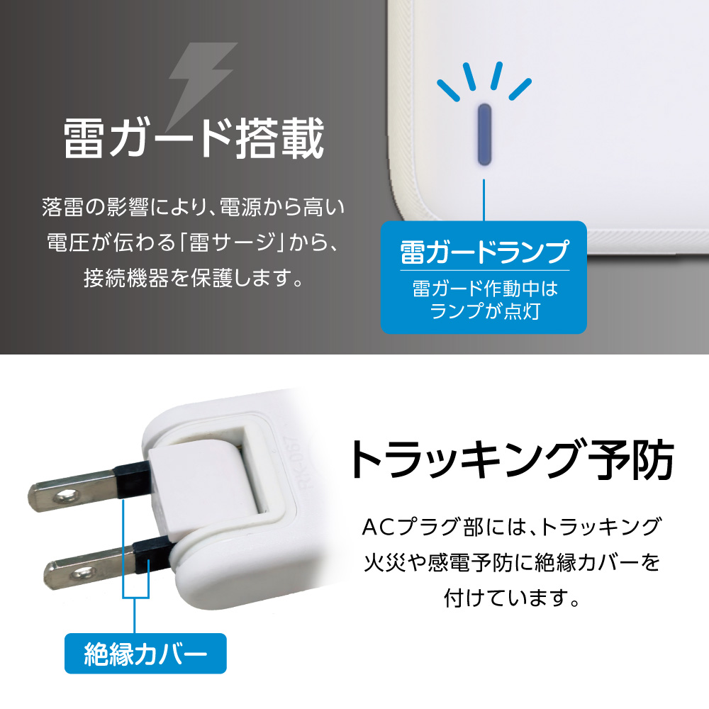 ●瞬時電圧から接続機器を守るサージ防護機能「雷ガード」搭載。