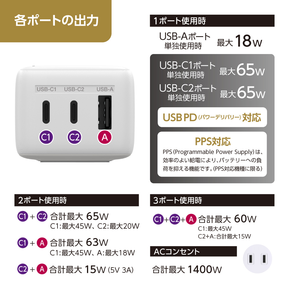 出力 : [USB-C1・USB-C2単独使用時] 最大65W