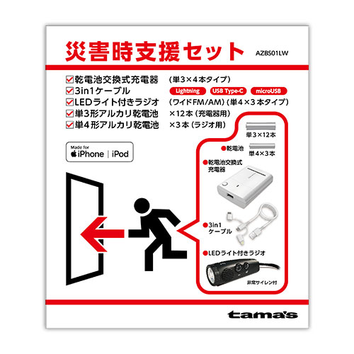 <セットの内訳>■乾電池交換式充電器(単3×4本タイプ)■3in1ケーブル■LEDライト付きラジオ(ワイドFM/AM)※単4×3本タイプ■単3形アルカリ乾電池×12本(充電器用)■単4形アルカリ乾電池×3本(ラジオ用)