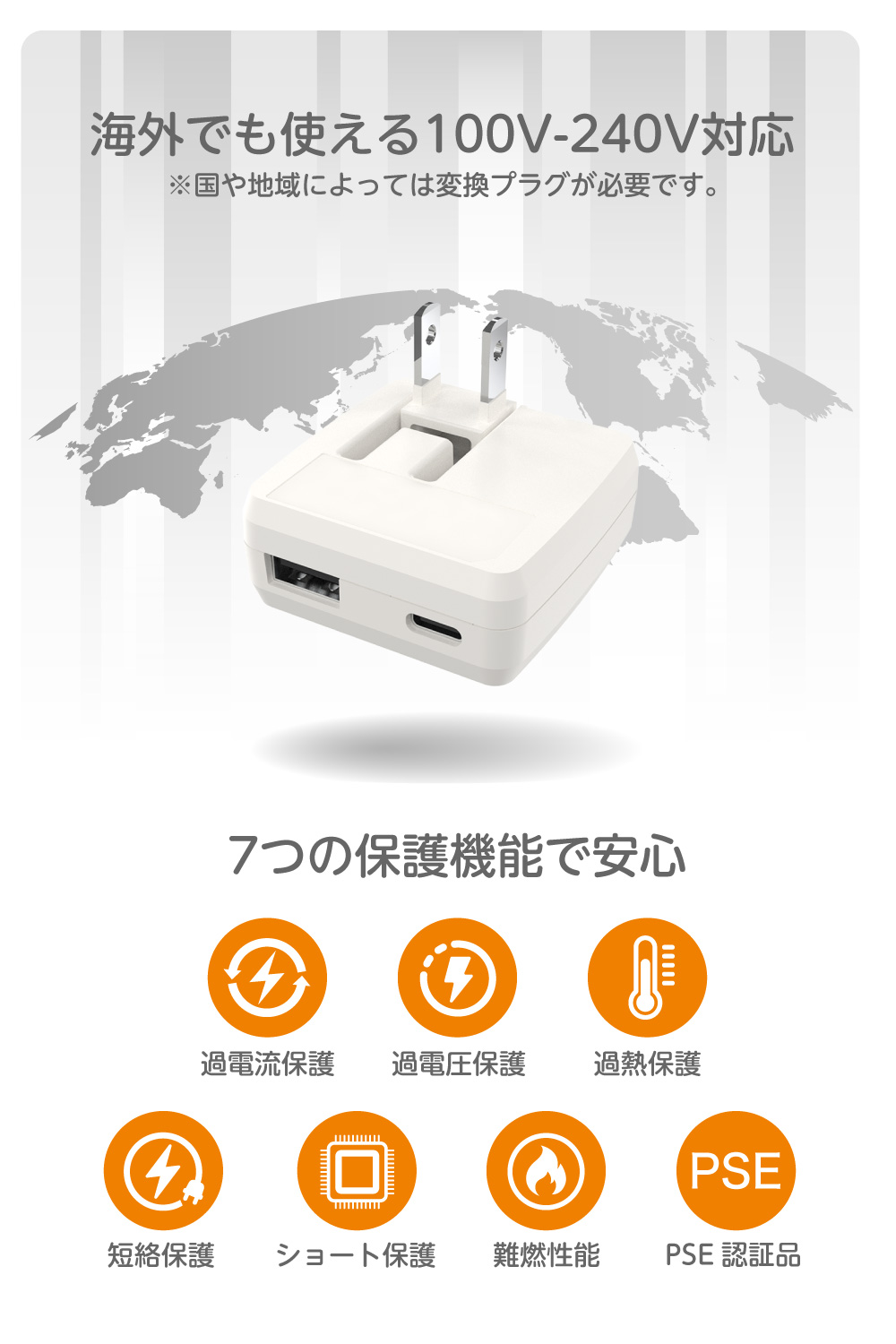 ●海外でも使用可能な100V-240V対応。