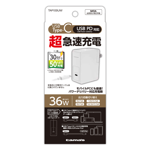 充電器 TAP100UW PD36W コンセントチャージャー ホワイト モバイルPCにも最適!パワーデリバリー対応充電器。 最大出力36W 超急速コンセント充電器 USB PD対応のUSB Type-Cポート 出力自動切り替え。 適合表 法人様向け製品問い合わせフォーム SKU・ TAP100UW カテゴリー: ALL, PD(パワーデリバリー対応), USB 充電器 PD対応, その他, カタログ(旧), 充電器, 製品カタログ tama's