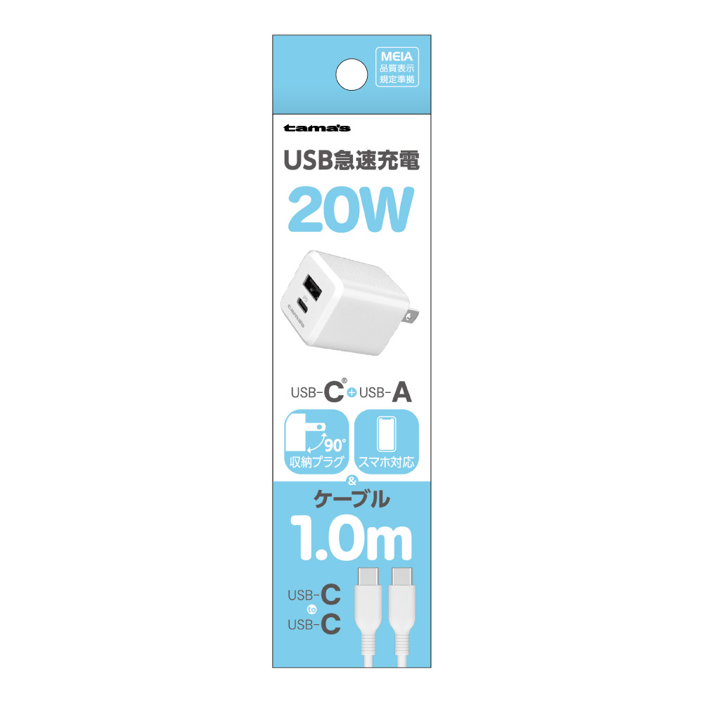 PD20W コンセントチャージャーC+A CtoCケーブル付き ホワイト