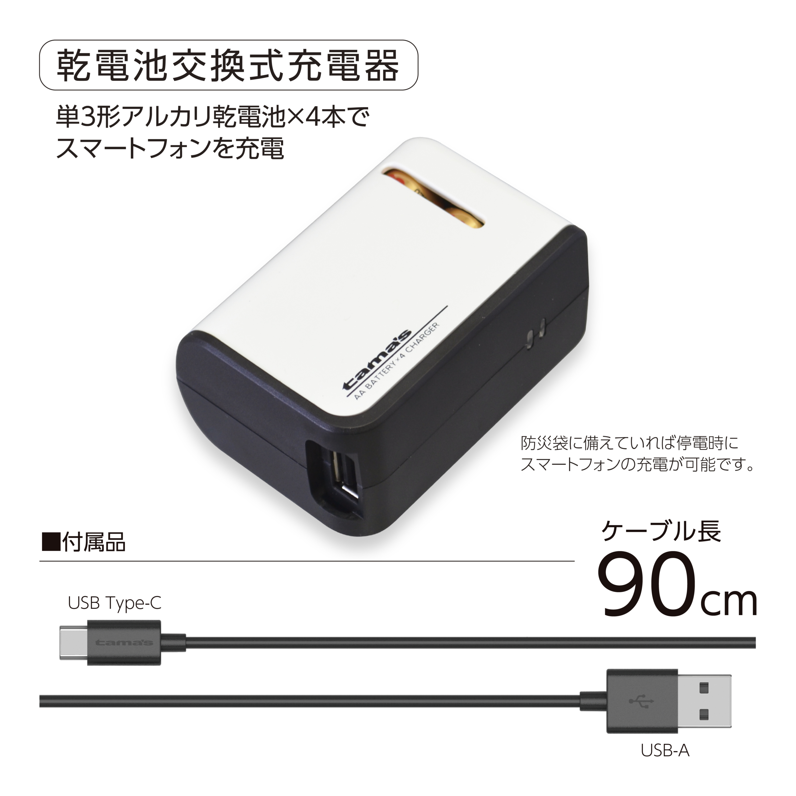 単3形アルカリ乾電池4本使用するスマートフォン用充電器。