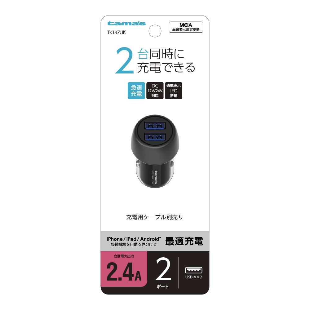 2ポート合計最大2.4A(1ポート最大2.4A)の出力でスマートフォンを2台同時に充電可能。