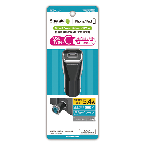 充電器 TK80CUK カーチャージャー5.4ACAポート 最大5V/3Aの超急速充電対応USB Type-Cポートを搭載。 iPadの充電やスマートフォンの急速充電が可能な高出力最大2.4AのUSB-Aポートを搭載。 ポートがブルーに光って暗い車内でも使いやすい。 トラックなどでも使用できる、DC12V/24V対応。 Smart Power Selectで最適充電。接続した機器をICが自動で見分けて最適な電流で充電を行います。 法人様向け製品問い合わせフォーム SKU・ TK80CUK カテゴリー: ALL, カタログ(旧), カーチャージャー, カーチャージャー, カー用品, 製品カタログ tama's