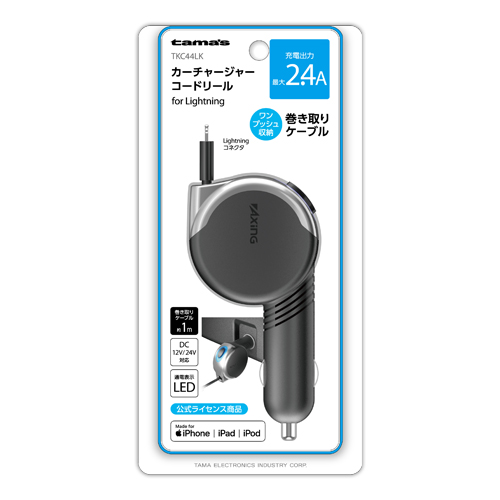 充電器 TKC44LK Lightningカーチャージャー巻取2.4A iPhone/iPod/iPadを車内で充電できる車載充電器。 充電器本体にすっきり収納できる巻き取りケーブル。 ブルーに光る通電表示イルミネーションLED搭載。 適合表 法人様向け製品問い合わせフォーム SKU・ TKC44LK カテゴリー: ALL, カタログ(旧), カーチャージャー, カーチャージャー ケーブル付き, カー用品, 製品カタログ tama's