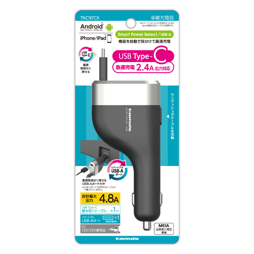 充電器 TKC97CK TypeCカーチャージャーコードリール4.8A 合計最大出力4.8AのType-C急速車載コードリール充電器。 接続機器を自動で見分けて最速充電する「最適充電」搭載。 トラックでも使用できるDC12V/DC24V車対応。 リバーシブルUAB-Aポート付き。 通電表示LED付。 適合表 法人様向け製品問い合わせフォーム SKU・ TKC97CK カテゴリー: ALL, カタログ(旧), カーチャージャー, カーチャージャー ケーブル付き, カー用品, 製品カタログ tama's