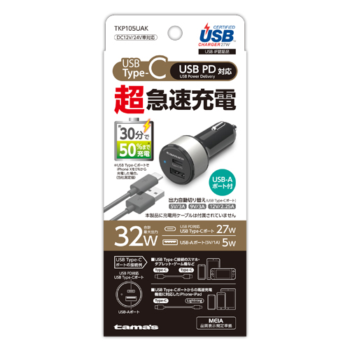 充電器 TKP105UAK PD32W カーチャージャーブラック パワーデリバリー対応車載充電器。 合計最大出力32W USB PD対応のUSB Type-Cポート 出力自動切り替え。 ※本製品に充電用ケーブルは付属されていません。 適合表 法人様向け製品問い合わせフォーム SKU・ TKP105UAK カテゴリー: ALL, カタログ(旧), カーチャージャー, カーチャージャー PD 対応, カー用品, 製品カタログ tama's