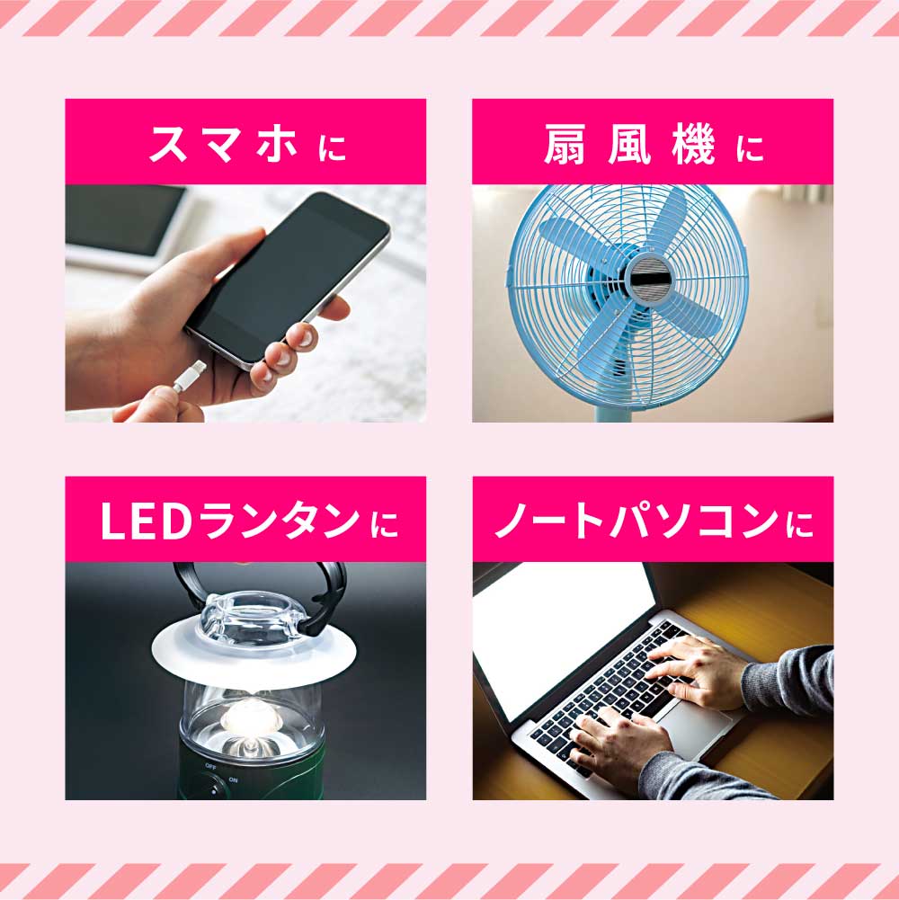 ・USB-A出力:USB−A×3ポート(5V/2.4A)合計最大7.2A