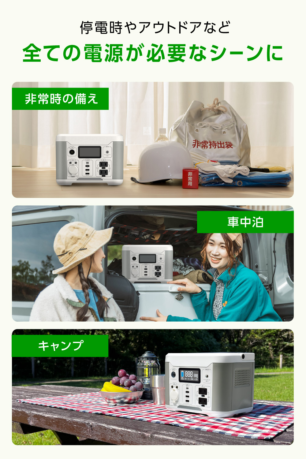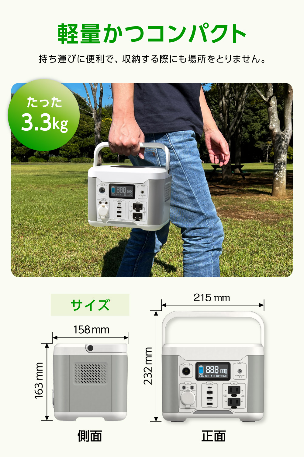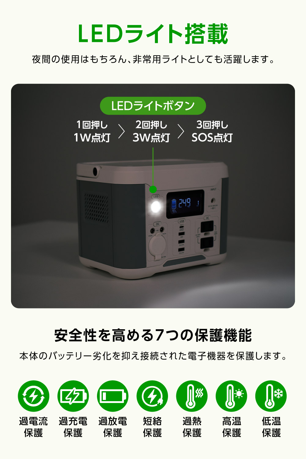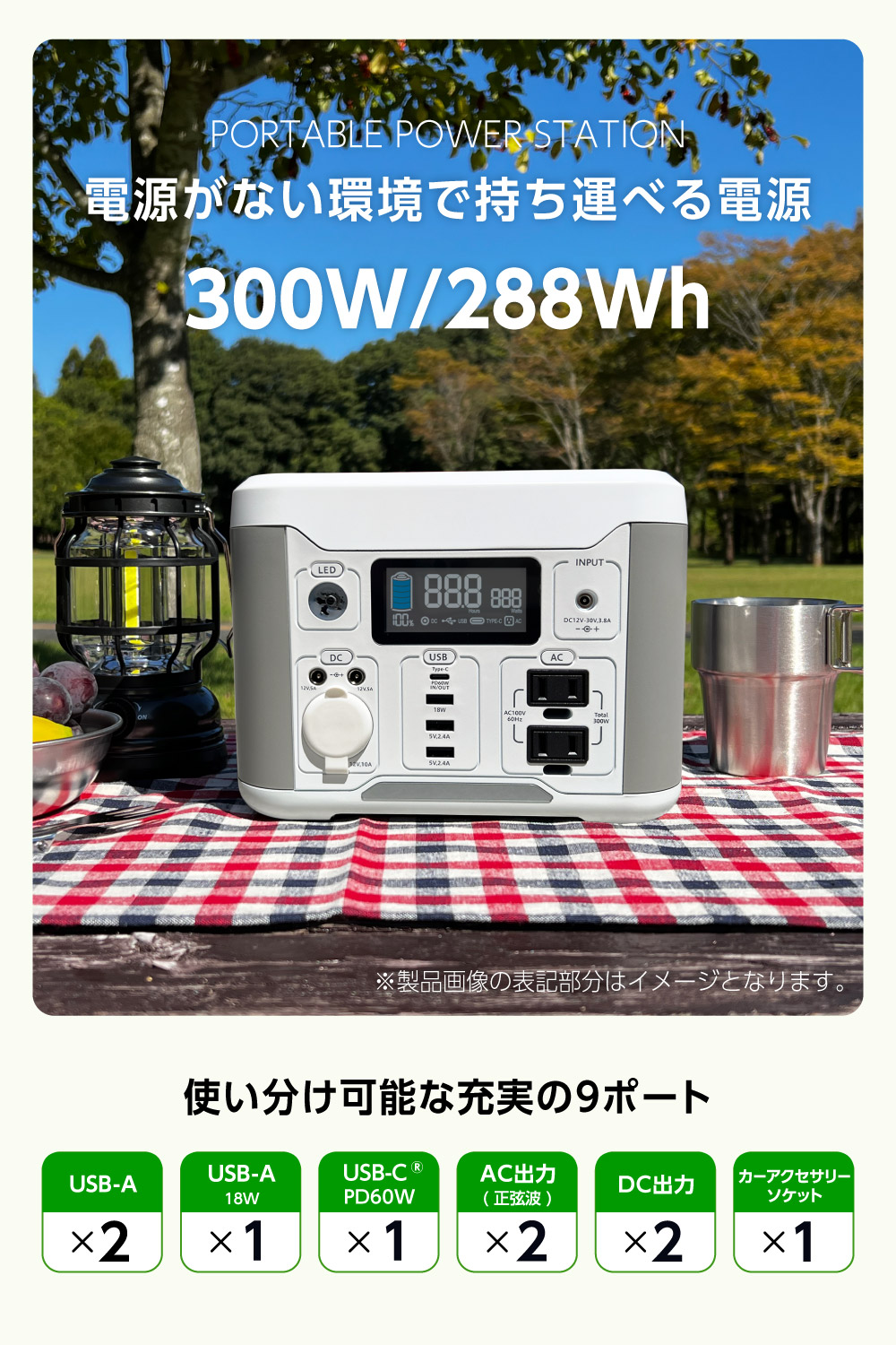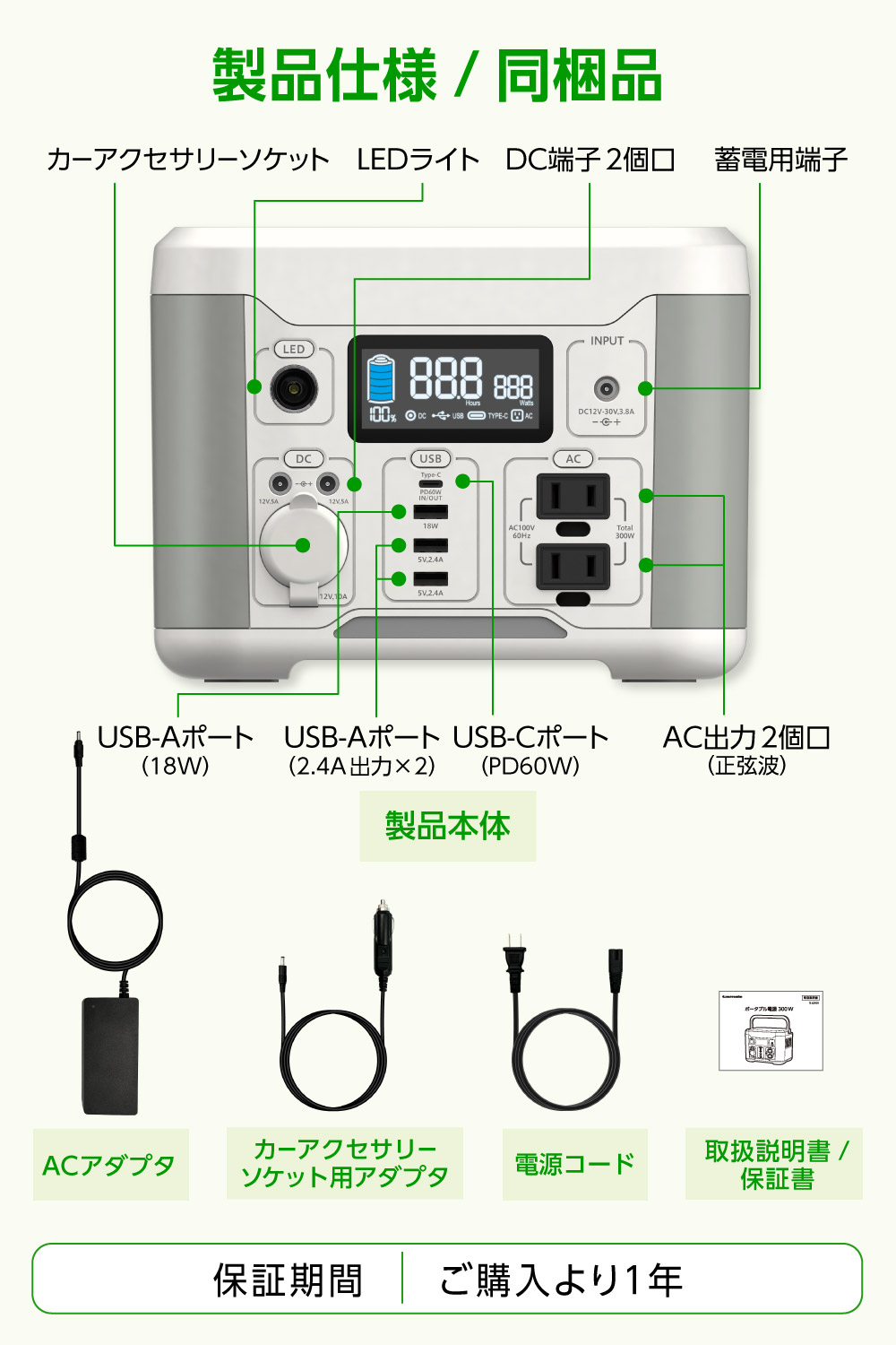 ●出力:AC出力(正弦波60Hz):AC100V x2個口(合計300W Max)、DC出力:カーアクセサリーソケットx1個口、DC端子 (DC12V/5A)x2個口、USB-A出力:5V/2.4A x2ポート、18W x1ポート(5V3A/ 9V2A/ 12V1.5A)、USB-C出力:1ポート(PD60W対応)