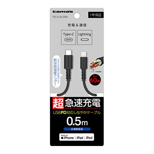 充電 ケーブル TSC212LC05K CtoLロングBケーブル0.5m黒 iPhone/iPad/iPodの充電とデータ転送可能なC to Lightningケーブル。 USB PD(パワーデリバリー)最大60Wの高速充電に対応。※USB PD対応機器に接続する必要があります。 ケーブル長は0.5m コネクタの根元を強化して耐屈曲強度アップ! 適合表 法人様向け製品問い合わせフォーム SKU・ TSC212LC05K カテゴリー: ALL, カタログ(旧), ライトニング