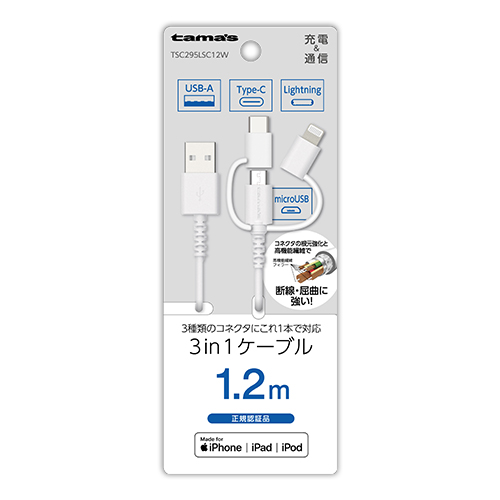 充電 ケーブル TSC295LSC12W 3in1ケーブル 1.2mWH 3種類のコネクタに、これ1本で対応。3in1ケーブル1.2m。 Lightning・Type-C・microUSBコネクタの3in1ケーブル。充電とデータ転送に対応。 コネクタの根元を強化して、断線に強い。 許容電流3Aでスピード充電。 取扱説明書ダウンロード 適合表 法人様向け製品問い合わせフォーム SKU・ TSC295LSC12W カテゴリー: ALL, その他, カタログ(旧)