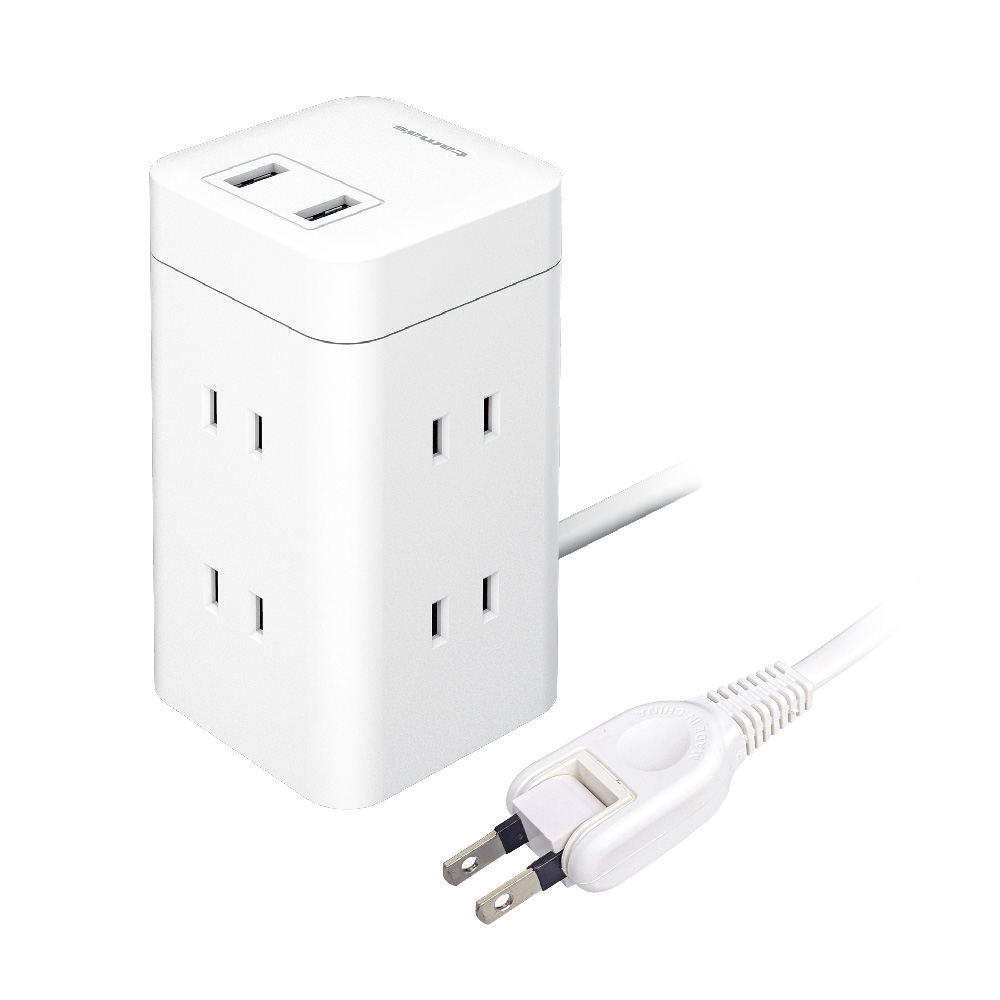 ●コンセント差込口×6とUSB-Aポート×2を備えたタワー型USBタップ。