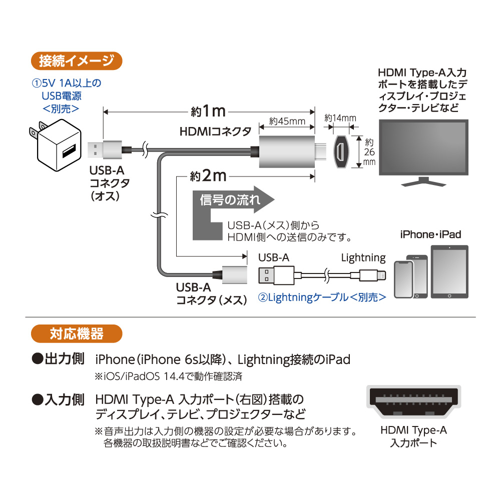 ●コネクタ:HDMI/USB-Aオス(給電用)・USB-Aメス(Lightningケーブル接続用)